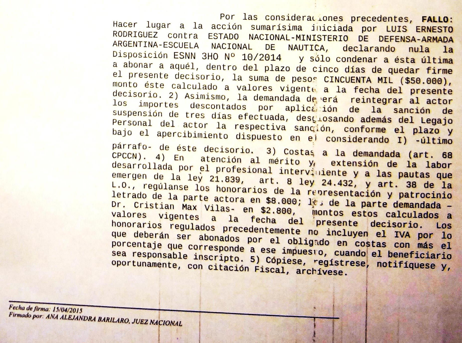 Asimismo y para cumplir con todos lo que se acercan a nuestra Institución, publicamos tambien un extracto de la SENTENCIA CONDENATORIA EMITIDA POR LA JUSTICIA LABORAL, por la cual la ARMADA ARGENTINA deberá dar marcha atrás a una arbitraria decisión de la Dirección de la misma ESCUELA NACIONAL DE NÁUTICA e INDEMNIZAR al delegado gremial de ATE en la escuela, quien según el criterio de la jueza actuante fue vicitma de una injusta suspensión por ejercer en democracia el elemental derecho de cumplir su función gremial.