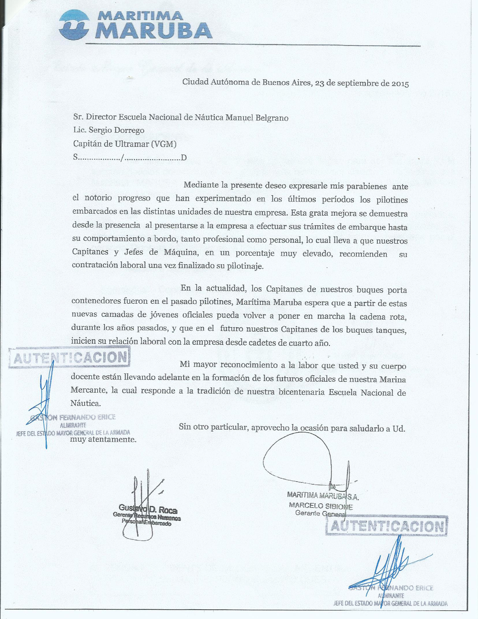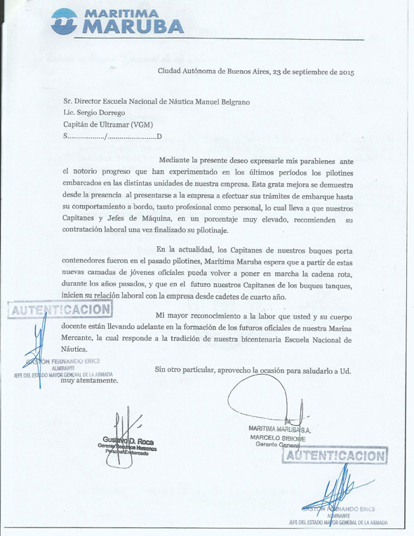 Es por ello que MARINA DIGITAL, cumpliendo el pedido de publicación que recibiéramos, hace pública la nota remitida al Señor Director, la que se encuentra firmada por el Ex dirigente gremial y hoy representante del sector armatorial Capitán de Ultramar Gustavo Roca; el Gerente General de la Empresa Privada Maruba, Marcelo Sibione y refrendada dos veces con la propia firma del Sr. JEFE DEL ESTADO MAYOR DE LA ARMADA EN EL CUERPO DE LA MISMA. MARINA DIGITAL NO PUEDE MENOS, que FELICITAR A TODA LA PLANA MAYOR Y CUERPO DOCENTE, por este logro. EXHORTANDO al resto de las navieras de nuestra marina mercante a sumarse a esta sentida felicitación a efectos de ratificar los logros académicos apreciados por esta empresa naviera ejemplo de cogestión empresario gremial.